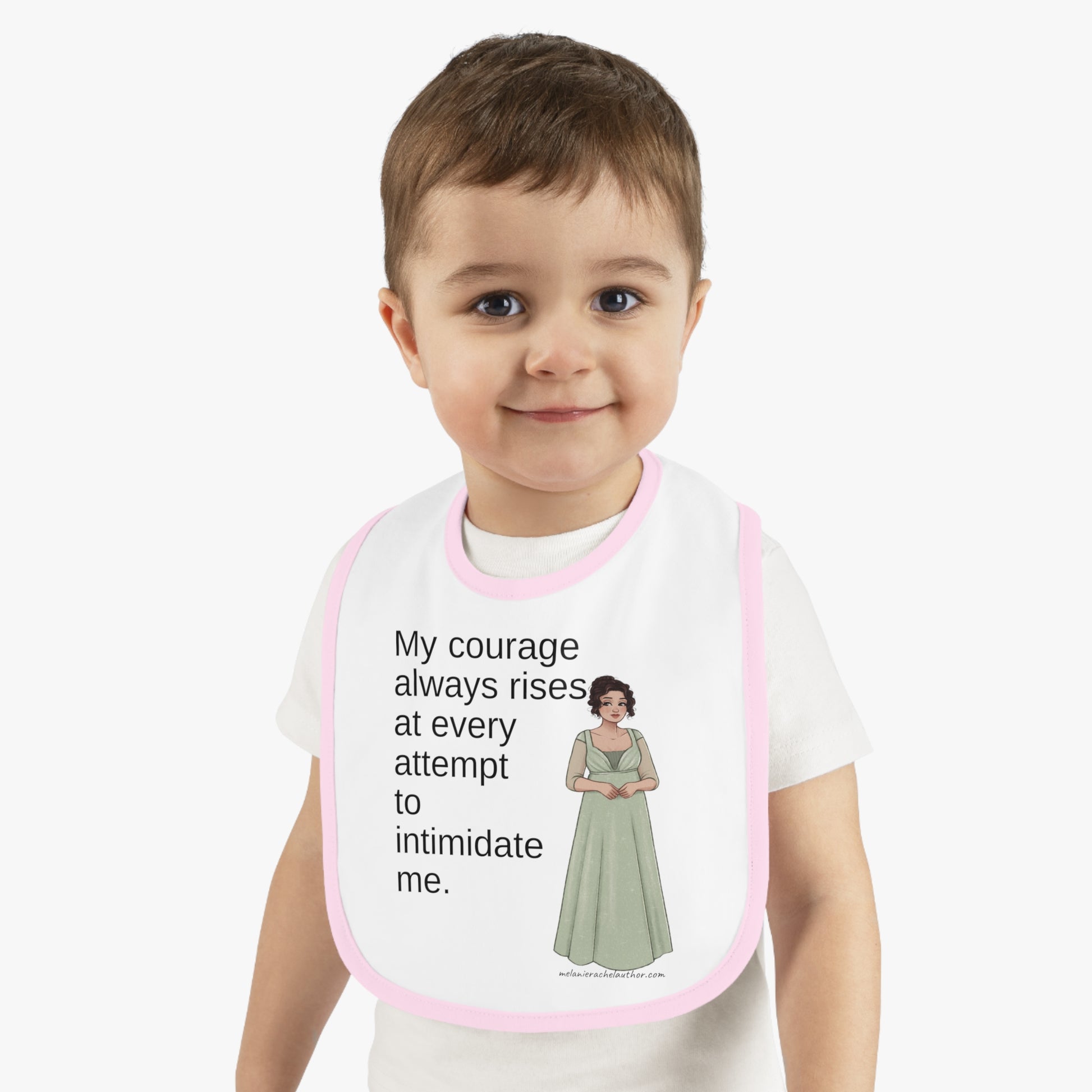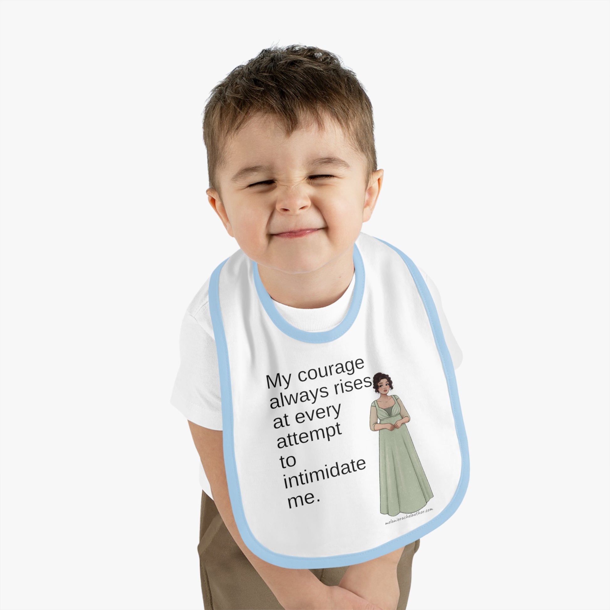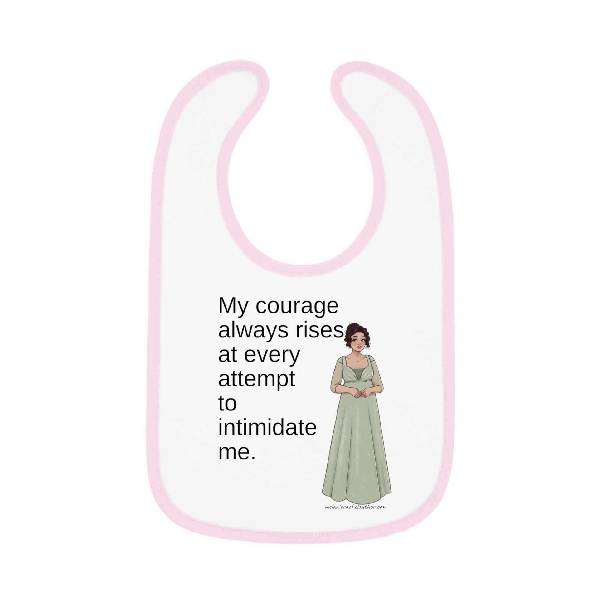 Mealtimes just became more fun with a "Courage" baby bib! Featuring a 100% Ring-spun Cotton fabric for delicate softness, an original Velcro® closure for a secure fit during meals, they are as adorable as they are comfy. Plus, the contrast self-fabric binding makes for a seamless look. With an 8” x 9” size, placing your own baby bib pattern makes this product a mom & pop favorite.