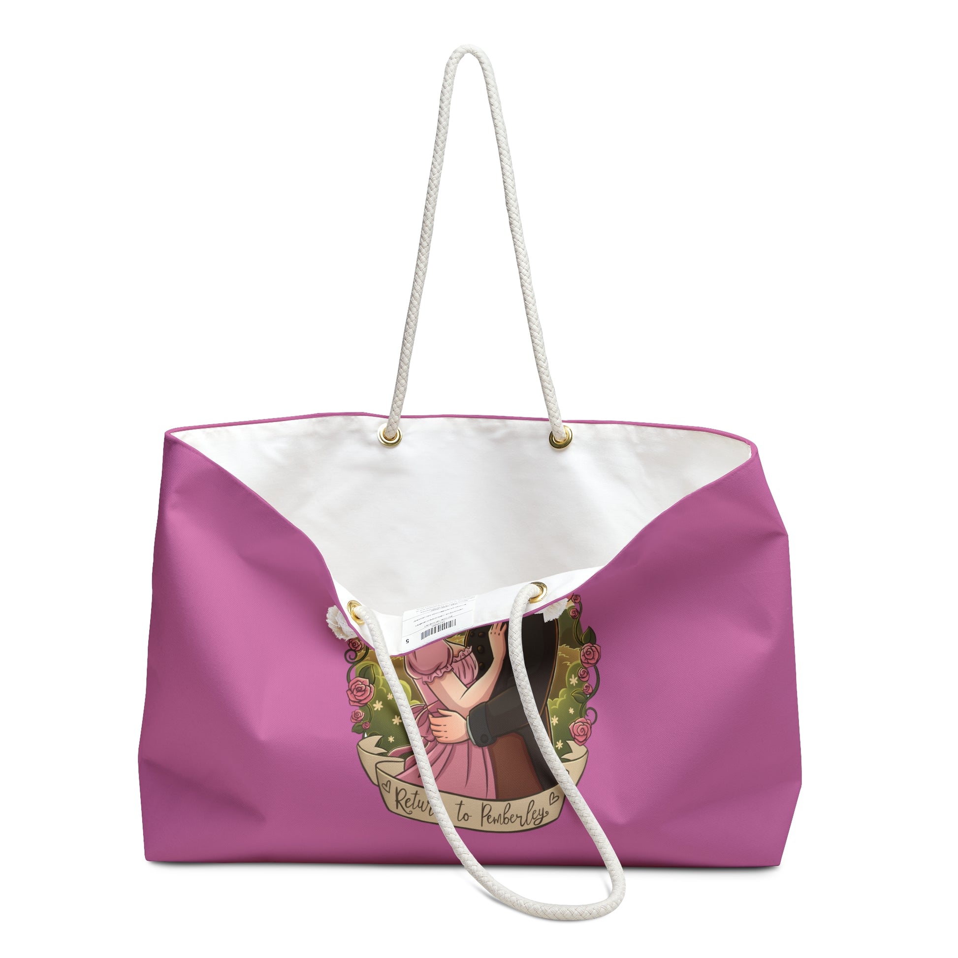 Our oversized "Returnto Pemberley" Weekender Tote is perfect for your weekend at the beach or in town. The wide-mouthed, durable bag holds a generous amount of personal items and is easily held by its thick rope handles.