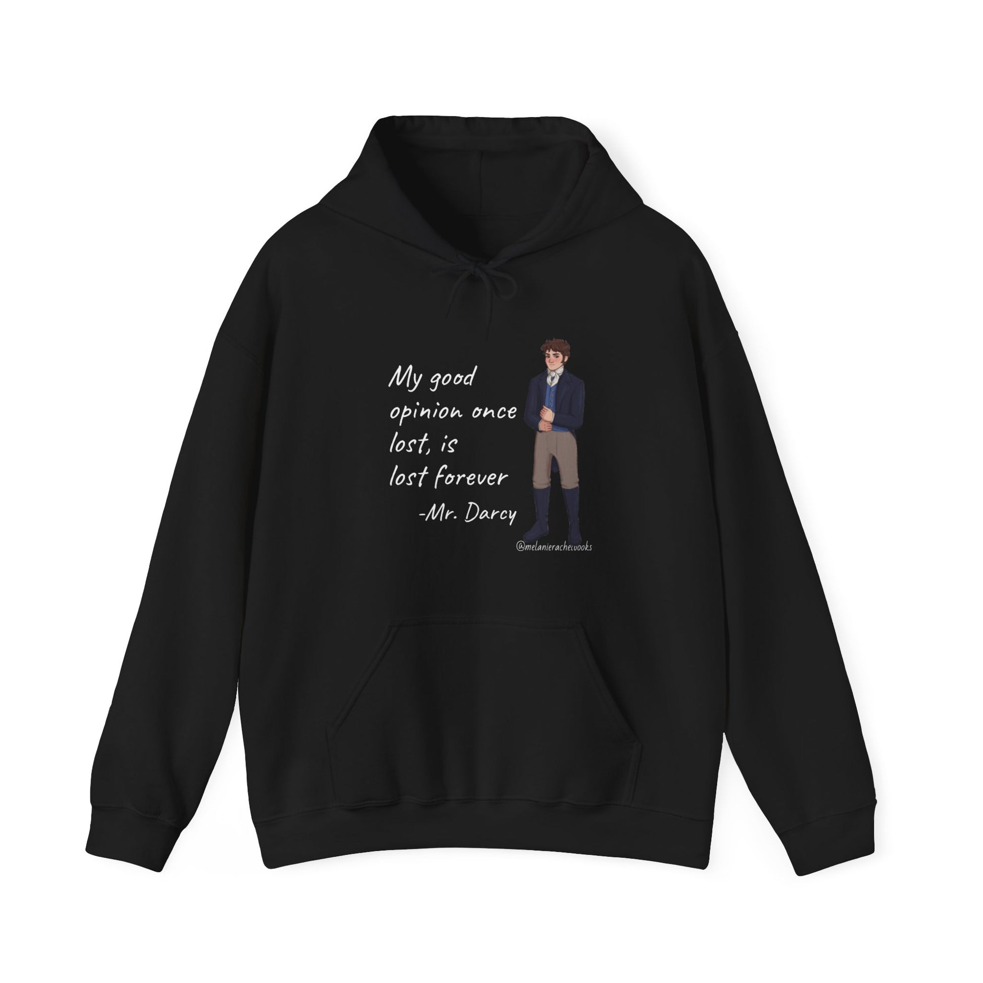 This Mr. Darcy's Opionion unisex heavy blend hooded sweatshirt is relaxation itself. Made with a thick blend of cotton and polyester, it feels plush, soft and warm, a perfect choice for any cold day. In the front, the spacious kangaroo pocket adds daily practicality while the hood's drawstring is the same color as the base sweater for extra style points.